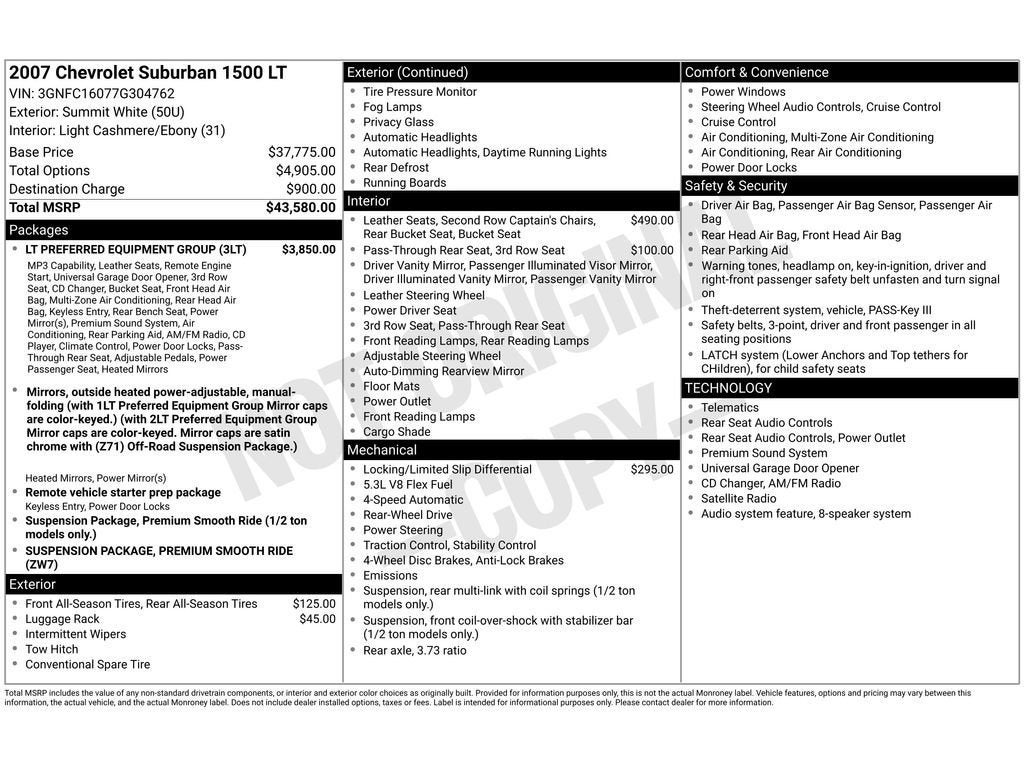 This Chevrolet Suburban is equipped with the latest generation of XM/Sirius Radio. Start this 1/2 ton suv from inside with remote start. The state of the art park assist system will guide you easily into any spot. The satellite radio system in this 2007 Chevrolet Suburban 1500 gives you access to hundreds of nation-wide radio stations with a clear digital signal. The leather seats in this model are a must for buyers looking for comfort, durability, and style. This 2007 Chevrolet Suburban 1500 offers Automatic Climate Control for personalized comfort. It features a high end BOSE stereo system. This 2007 Chevrolet Suburban 1500 has a V8, 5.3L high output engine. Keep safely connected while in this model with OnStar. You may enjoy services like Automatic Crash Response, Navigation, Roadside Assistance and Hands-Free Calling. Load groceries and much more with ease into the vehicle thanks to the power liftgate. Set the temperature exactly where you are most comfortable in this 2007 Chevrolet Suburban 1500. The fan speed and temperature will automatically adjust to maintain your preferred zone climate.