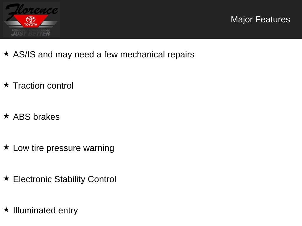 AS/IS and may need a few mechanical repairs, Corolla LE, 4D Sedan, 1.8L I4 DOHC Dual VVT-i, 4-Speed Automatic, FWD, ABS brakes, Electronic Stability Control, Illuminated entry, Low tire pressure warning, Traction control.