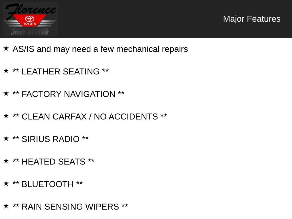 At Florence Toyota come see how our USED CARS are JUST BETTER . We offer the following benefits: Lifetime Power Train (Some exclusions apply), 1st Year Maintenance, $500 Additional Trade In Appraisal, 72 Hour Vehicle Exchange Program, Yearly Vehicle Appraisal & Safety Inspection, VIP Loyalty Program, Routine Express Service, Courtesy Service Shuttle, Express Buying Service. Also, as an added benefit we will buy your vehicle even if you don't buy ours!! Call today (866)830-0793or visit us at www.florencetoyota.com *Customer must trade-in a vehicle to receive $1,000 Trade Assist credit that is included in the online price. **Financing must be provided by a third-party lender using this dealership’s assistance for Customer to receive $1,000 Financing Assist credit that is included in the online price. See dealer for complete details.