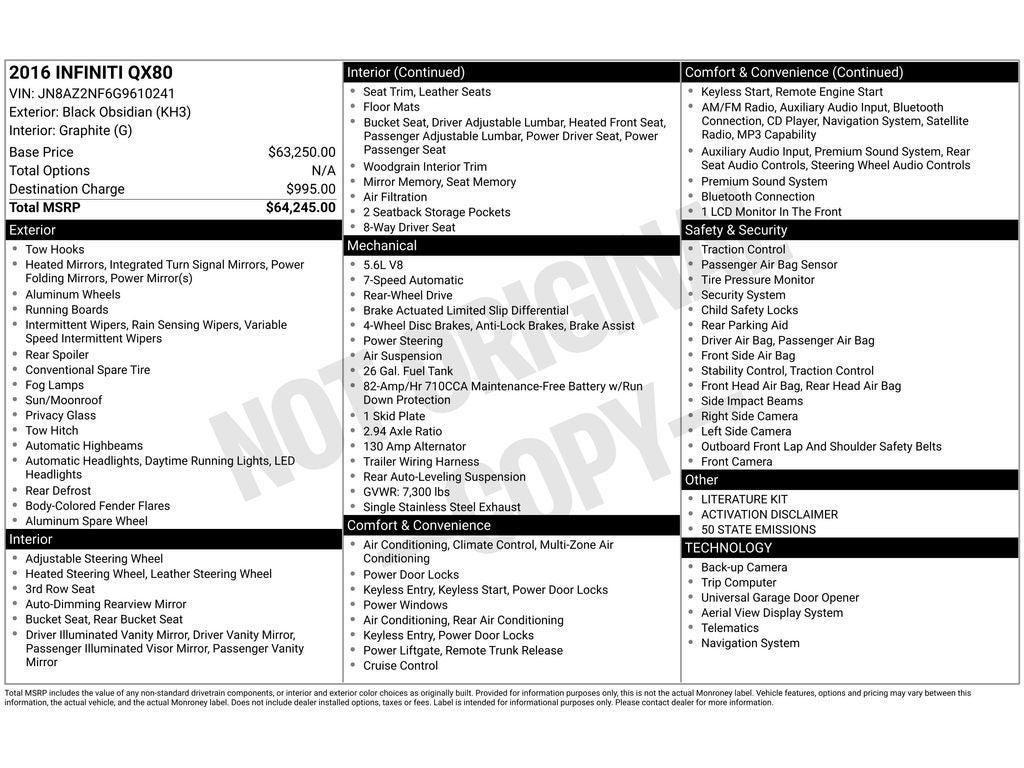 You'll never again be lost in a crowded city or a country region with the navigation system on this unit. This model keeps you comfortable with Auto Climate. Start this 2016 INFINITI QX80 from inside with remote start. It features a hands-free Bluetooth® phone system. It features a high end BOSE stereo system. Protect this vehicle from unwanted accidents with a cutting edge backup camera system. Keep your hands warm all winter with a heated steering wheel in this 1/2 ton suv . The rear parking assist technology on the INFINITI QX80 will put you at ease when reversing. The system alerts you as you get closer to an obstruction. The leather seats in it are a must for buyers looking for comfort, durability, and style. The vehicle has a V8, 5.6L high output engine. This vehicle has an elegant black exterior finish. The vehicle is rear wheel drive. Load groceries and much more with ease into this vehicle thanks to the power liftgate.