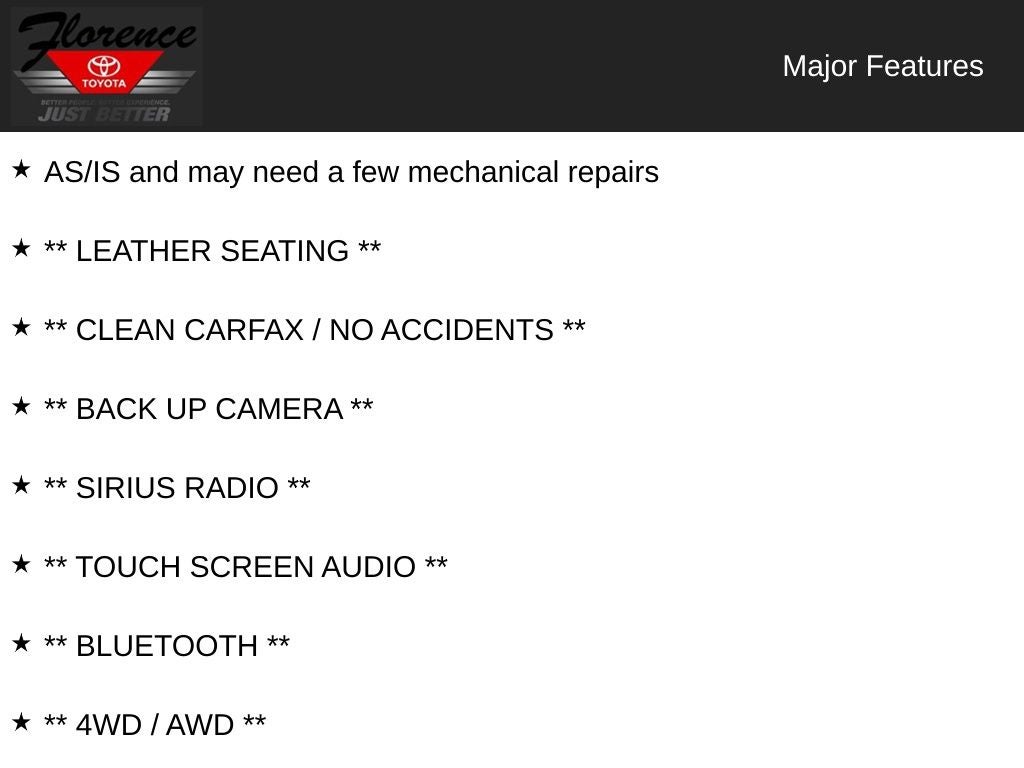 AS/IS and may need a few mechanical repairs, ** LEATHER SEATING **, ** CLEAN CARFAX / NO ACCIDENTS **, ** BACK UP CAMERA **, ** SIRIUS RADIO **, ** TOUCH SCREEN AUDIO **, ** Bluetooth® **, ** 4WD / AWD **, WRX STi, 4D Sedan, 2.5L DOHC Intercooled High-Boost DAVCS, Close-Ratio 6-Speed Manual, AWD, Aluminum Wheel Lock Kit, Auto-Dimming Mirror w/Compass & HomeLink, Automatic temperature control, Cargo Tray, CD player, Front dual zone A/C, Front fog lights, Off-Black Center Armrest Extension, Popular Package #3, Rear Bumper Applique, Remote keyless entry, SPT Carbon Fiber Trunk Trim, Steering wheel mounted audio controls.