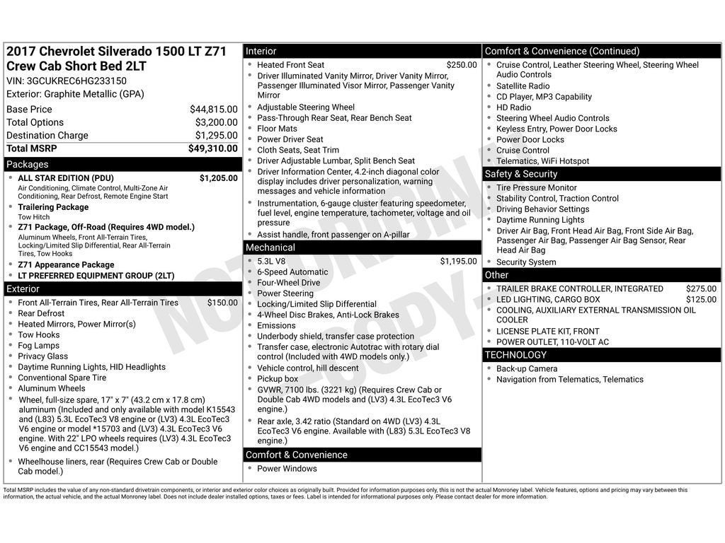 All Star Edition: Manual Tilt/telescoping Steering Column; Remote Vehicle Starter System; 110-Volt AC Power Outlet; Electric Rear-Window Defogger; Dual-Zone Automatic Climate Control; 10-Way Power Driver Seat Adjuster. Preferred Equipment Group 2LT: Body Color Bodyside Moldings; EZ Lift and Lower Tailgate; Rear Vision Camera; Rear 60/40 Folding Bench Seat (folds Up); Cloth Seat Trim; Bluetooth® For Phone; Body-Color Grille Surround; Front Body-Color Bumper; AM/FM 8" Diagonal Color Touch Screen Radio; 4.2" Diagonal Color Display Driver Info Center; Rear Chrome Bumper; 6 Speaker Audio System; Thin Profile LED Fog Lamps; Remote Locking Tailgate; Front Chrome Bumper; 150 Amp Alternator; 40/20/40 Front Split Bench Seat; Steering Wheel Audio Controls; Color-Keyed Carpeting with Rubberized Vinyl Floor Mats; Power Windows with Driver Express Up; OnStar 3 Months Guidance Plan; Remote Keyless Entry; P265/70R17 AS BW Spare Tire; Single Slot CD/MP3 Player; Body-Color Door Handles; 4WD Active Transfer Case; Deep-Tinted Glass; Body-Color Mirror Caps; HD Radio; Body-Color Headlamp Bezels; Manual Tilt Wheel Steering Column; Body-Color Power Adjustable Heated Outside Mirrors; Leather Wrapped Steering Wheel with Cruise Controls; Driver and Front Passenger Illuminated Vanity Mirrors; OnStar with 4G LTE; Off-Road Suspension Package; Body Color Rear Bumper with Cornersteps; Rear Wheelhouse Liners. Integrated Trailer Brake Controller. Heated Driver and Front Passenger Seats. P265/65R18 AT OWL Tires. LED Cargo Box Lighting. **Equipment listed is based on original vehicle build and subject to change. Please confirm the accuracy of the included equipment by calling the dealer prior to purchase.**