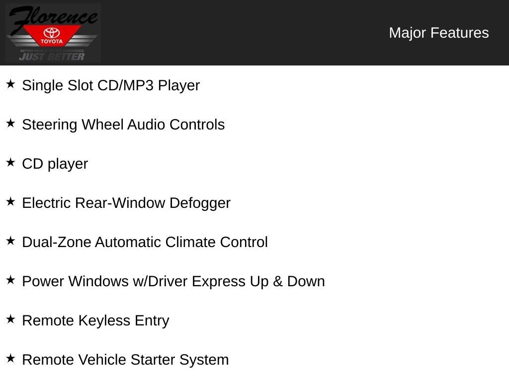At Florence Toyota come see how our USED CARS are JUST BETTER . We offer the following benefits: Lifetime Power Train (Some exclusions apply), 1st Year Maintenance, $500 Additional Trade In Appraisal, 72 Hour Vehicle Exchange Program, Yearly Vehicle Appraisal & Safety Inspection, VIP Loyalty Program, Routine Express Service, Courtesy Service Shuttle, Express Buying Service. Also, as an added benefit we will buy your vehicle even if you don't buy ours!! Call today (866)830-0793or visit us at www.florencetoyota.com *Customer must trade-in a vehicle to receive $1,000 Trade Assist credit that is included in the online price. **Financing must be provided by a third-party lender using this dealership’s assistance for Customer to receive $1,000 Financing Assist credit that is included in the online price. See dealer for complete details.