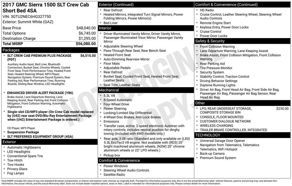 AS/IS and may need a few mechanical repairs, ** LEATHER SEATING **, ** FACTORY NAVIGATION **, ** CLEAN CARFAX / NO ACCIDENTS **, ** BACK UP CAMERA **, ** SIRIUS RADIO **, ** TOUCH SCREEN AUDIO **, ** HEATED SEATS **, ** COOLED SEATS **, ** Bluetooth® **, ** 4WD / AWD **, ** PREMIUM AUDIO SYSTEM **, Sierra 1500 SLT, 4D Crew Cab, EcoTec3 5.3L V8, 8-Speed Automatic with Overdrive, 4WD, 110-Volt AC Power Outlet, 150 Amp Alternator, 1st & 2nd Row Color-Keyed Carpeted Floor Mats, 2-Speed Active Electronic AutoTrac Transfer Case, 20 x 9 Chrome Clad Aluminum Wheels, 4.2 Diagonal Color Display Driver Info Center, 6 Rectangular Chromed Tubular Assist Steps, Auto-Dimming Inside Rear-View Mirror, Auxiliary External Transmission Oil Cooler, CD player, Chrome Bodyside Moldings, Chrome Door Handles, Chrome Mirror Caps, Color-Keyed Carpeting, Deep-Tinted Glass, Driver & Front Passenger Illuminated Vanity Mirrors, Dual-Zone Automatic Climate Control, Electric Rear-Window Defogger, Enhanced Driver Alert Package, EZ Lift & Lower Tailgate, Front fog lights, Front Frame-Mounted Black Recovery Hooks, Front Full Feature Power Reclining Bucket Seats, Fully automatic headlights, Heated & Ventilated Front Bucket Seats, Heavy-Duty Rear Locking Differential, High-Performance LED Headlamps, Integrated Trailer Brake Controller, Leather Wrapped Heated Steering Wheel, Leather Wrapped Steering Wheel w/Cruise Controls, LED Cargo Box Lighting, LED Tailamps w/Signature, Manual Tilt/Telescoping Steering Column, OnStar 3 Month Guidance Plan, OnStar w/4G LTE, Power Adjustable Pedals, Power Folding & Adjustable Heated Outside Mirrors, Power Sliding Rear Window w/Defogger, Power Windows w/Driver Express Up & Down, Preferred Equipment Group 4SA, Rear 60/40 Folding Bench Seat (Folds Up), Rear Vision Camera, Rear Wheelhouse Liners, Remote Keyless Entry, Remote Vehicle Starter System, Single Slot CD/MP3 Player, SLT Crew Cab Premium Plus Package, Spray-On Pickup Box Bed Liner w/GMC Logo, Steering Wheel Audio Controls, Theft Deterrent System (Unauthorized Entry), Thin Profile LED Fog Lamps, Trailering Equipment, Universal Home Remote.