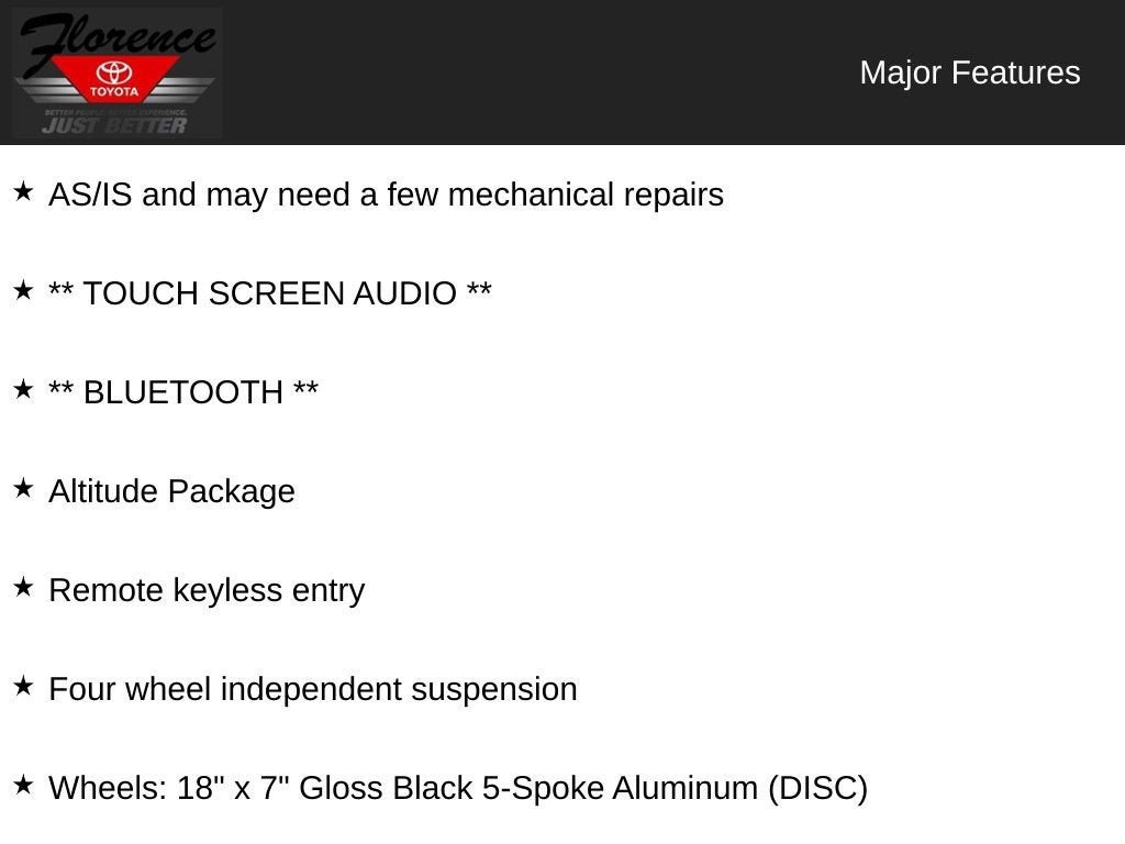 2017 Jeep Cherokee Altitude - stylish, capable and ready for Florence SC roads. This well-maintained Jeep Cherokee Altitude pairs an efficient 2.4L 4-cylinder gasoline engine with smooth front-wheel drive for confident daily commuting and highway cruising. The bold Altitude appearance package gives this Jeep Cherokee a distinctive presence, with HID Xenon headlamps delivering crisp nighttime visibility and a sleek exterior that stands out at every stoplight. Inside, this Jeep Cherokee blends comfort and connectivity. Enjoy hands-free Bluetooth® for safe phone calls and seamless audio streaming. The cabin is thoughtfully designed with supportive seating and modern convenience features that make every drive more enjoyable, whether you're running errands around Florence or taking a weekend escape. Safety-focused technology and solid build quality provide peace of mind. The responsive handling of the FWD system and efficient 4-cylinder engine help maximize fuel economy without sacrificing capability. With practical cargo space and flexible seating, this Jeep Cherokee Altitude adapts to your lifestyle - groceries, gear, or passengers. Located in Florence SC, this 2017 Jeep Cherokee Altitude is ready for a test drive. Ideal for drivers seeking a stylish crossover with reliable performance, modern lighting technology, and Bluetooth® connectivity. Contact us to schedule a viewing and experience the blend of comfort, efficiency, and distinctive Altitude style in person.