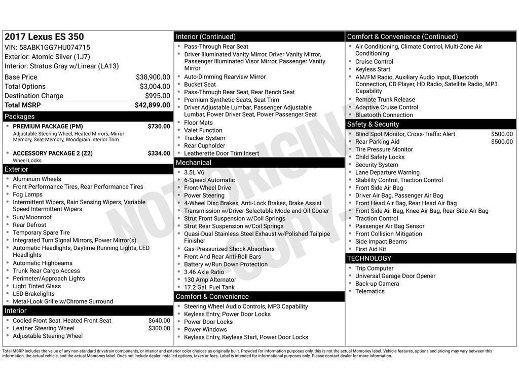 The leather seats in this unit are a must for buyers looking for comfort, durability, and style. The rear parking assist technology on this 2017 Lexus ES 350 will put you at ease when reversing. The system alerts you as you get closer to an obstruction. The Lexus ES 350 has automated speed control that adjusts to maintain a safe following distance, enhancing highway driving convenience. The vehicle keeps you comfortable with Auto Climate. See what's behind you with the back up camera on the vehicle. This Lexus ES 350 features a hands-free Bluetooth® phone system. The vehicle's Lane Departure Warning helps keep you in your lane. This Lexus ES 350 enhances safety with a blind spot monitor, alerting drivers to potential dangers in adjacent lanes. Set the temperature exactly where you are most comfortable in the vehicle. The fan speed and temperature will automatically adjust to maintain your preferred zone climate.