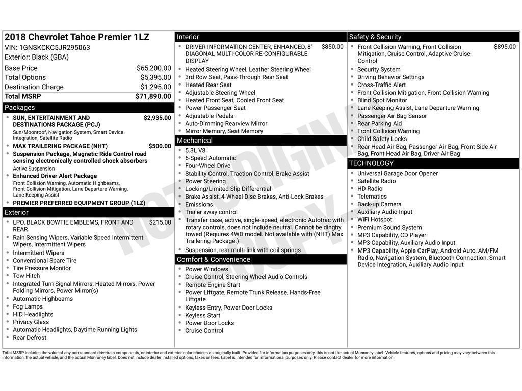Keep your hands warm all winter with a heated steering wheel in this Chevrolet Tahoe . You'll never again be lost in a crowded city or a country region with the navigation system on this Chevrolet Tahoe. The leather seats in it are a must for buyers looking for comfort, durability, and style. The vehicle's Cross-Traffic Alert: Safeguarding you from unexpected traffic when reversing. It has satellite radio capabilities. The vehicle features a hands-free Bluetooth® phone system. This unit has automated speed control that adjusts to maintain a safe following distance, enhancing highway driving convenience. This 2018 Chevrolet Tahoe features a high end BOSE stereo system. Protect the vehicle from unwanted accidents with a cutting edge backup camera system. This Chevrolet Tahoe offers Android Auto for seamless smartphone integration. Lane Keep Assist in this unit helps maintain safe driving by gently steering to stay within the lane. This unit offers Apple CarPlay for seamless connectivity.