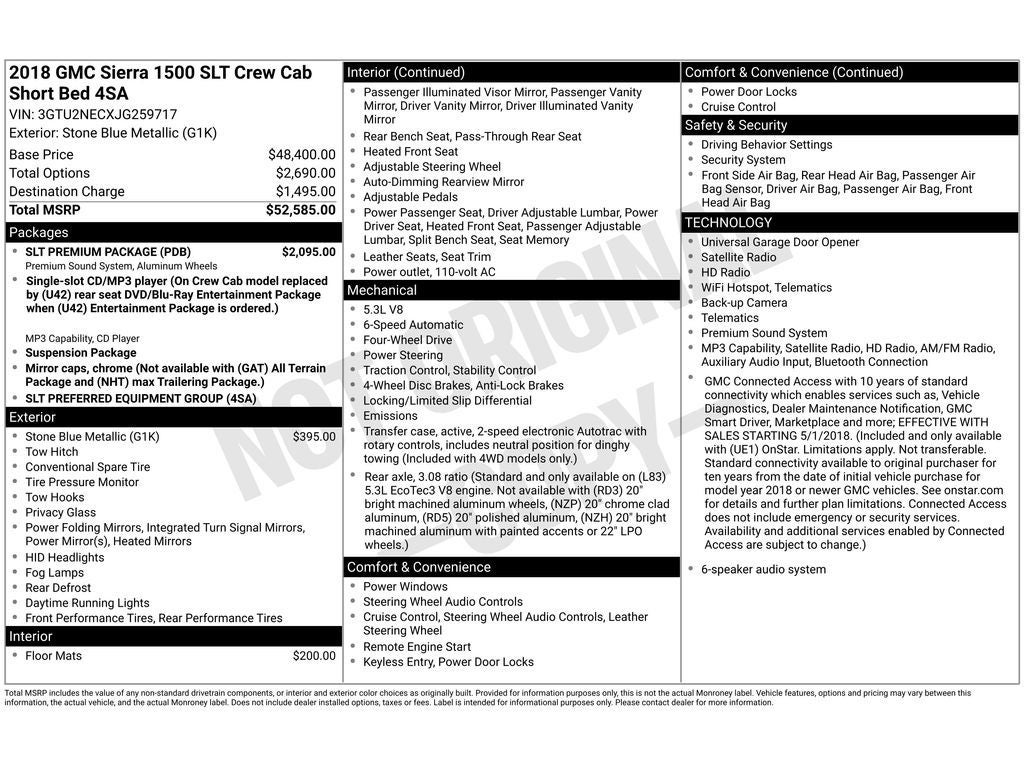SLT Premium Package: 20" X 9" Polished Aluminum Wheels; Bose Speaker System; 6" Rectangular Chromed Tubular Assist Steps. Preferred Equipment Group 4SA: LED Cargo Box Lighting; EZ Lift and Lower Tailgate; Chrome Door Handles; Rear 60/40 Folding Bench Seat (folds Up); Leather Appointed Seat Trim; Remote Vehicle Starter System; 5.3L EcoTec3 V8 Engine; Electric Rear Window Defogger; Theft Deterrent System (unauthorized Entry); Auxiliary External Transmission Oil Cooler; AM/FM/GMC Infotainment System Radio; 4.2" Diagonal Color Display Driver Info Center; Trailering Equipment; 110-Volt AC Power Outlet; Thin Profile LED Fog Lamps; 150 Amp Alternator; Steering Wheel Audio Controls; Universal Home Remote; Color-Keyed Carpeting; Power Windows with Driver Express Up and Down; OnStar and GMC Connected Services Capable; Remote Keyless Entry; P265/70R17 AS BW Spare Tire; Single Slot CD/MP3 Player; 2-Speed Active Electronic Autotrac Transfer Case; 1st and 2nd Row Color-Keyed Carpeted Floor Mats; Deep-Tinted Glass; Dual-Zone Automatic Climate Control; Power Folding and Adjustable Heated Outside Mirrors; Chrome Mirror Caps; Leather Wrapped Steering Wheel with Cruise Controls; Manual Tilt/telescoping Steering Column; Driver and Front Passenger Illuminated Vanity Mirrors; Front Frame-Mounted Black Recovery Hooks; GMC 4G LTE; 40/20/40 Front Split Bench Seat; LED Tailamps with Signature; Auto-Dimming Inside Rearview Mirror; Power Adjustable Pedals; Rear Wheelhouse Liners; Heavy-Duty Rear Locking Differential; Chrome Bodyside Moldings. 20" X 9" Polished Aluminum Wheels. 6" Rectangular Chromed Tubular Assist Steps. Bose Speaker System. Stone Blue Metallic. Stone Blue Metallic. All-Weather Floor Liner. **Equipment listed is based on original vehicle build and subject to change. Please confirm the accuracy of the included equipment by calling the dealer prior to purchase.**