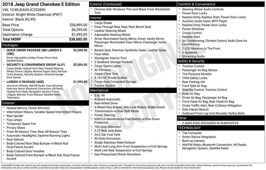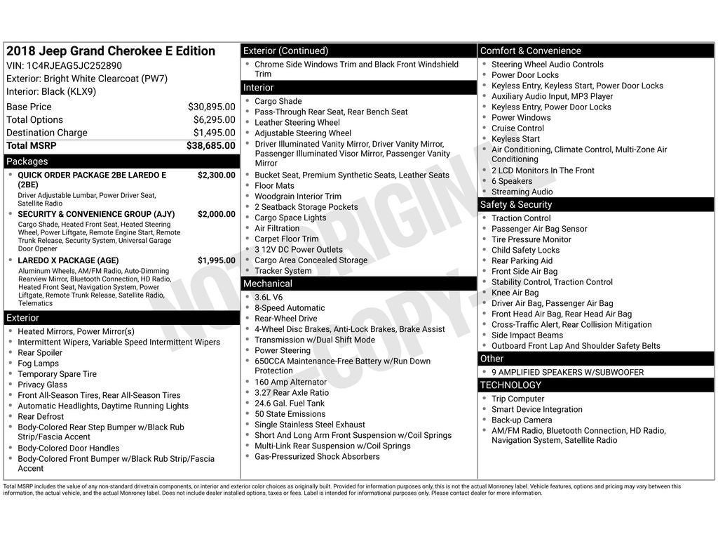 AS/IS and may need a few mechanical repairs, ** ONE OWNER **, ** LEATHER SEATING **, ** CLEAN CARFAX / NO ACCIDENTS **, ** BACK UP CAMERA **, ** SIRIUS RADIO **, ** PUSH BUTTON / KEYLESS START **, ** TOUCH SCREEN AUDIO **, ** HEATED SEATS **, ** POWER LIFTGATE **, ** Bluetooth® **, ** APPLE CAR PLAY / ANDROID AUTO **, Grand Cherokee Laredo E, 4D Sport Utility, 3.6L V6 24V VVT, 8-Speed Automatic, RWD, 1-Year SiriusXM Guardian Trial, 115V Auxiliary Power Outlet, 5-Year SiriusXM Traffic Service, 5-Year SiriusXM Travel Link Service, 8.4 Touchscreen Display, 9 Amplified Speakers w/Subwoofer, Auto-Dimming Rear-View Mirror, Automatic temperature control, Black Suede Seats w/Black Stitching, Bright Side Roof Rails, For Details Visit DriveUconnect.com, Front dual zone A/C, Front fog lights, Fully automatic headlights, GPS Navigation, HD Radio, Heated Steering Wheel, Laredo X Package, Power 4-Way Driver Lumbar Adjust, Power 8-Way Driver/Manual Passenger Seat, Quick Order Package 2BE Laredo E, Radio: Uconnect 4C Nav w/8.4 Display, Remote Start System, Security & Convenience Group, SiriusXM Traffic Plus, SiriusXM Travel Link, Universal Garage Door Opener, Wheels: 18 x 8.0 Tech Gray Aluminum.