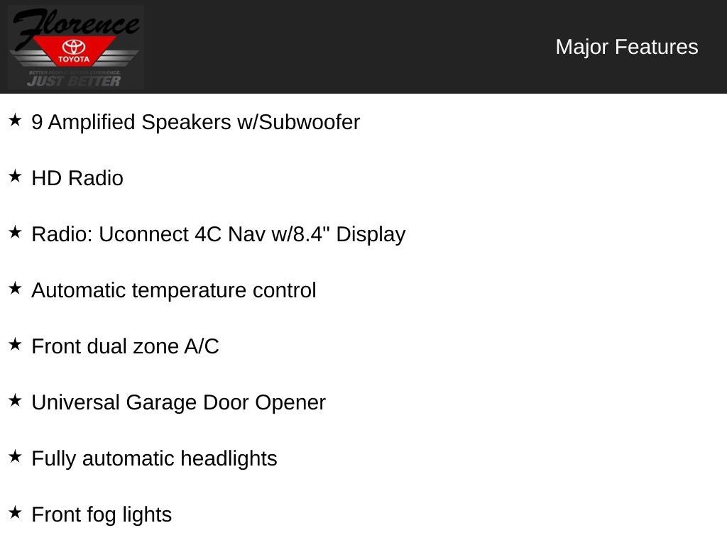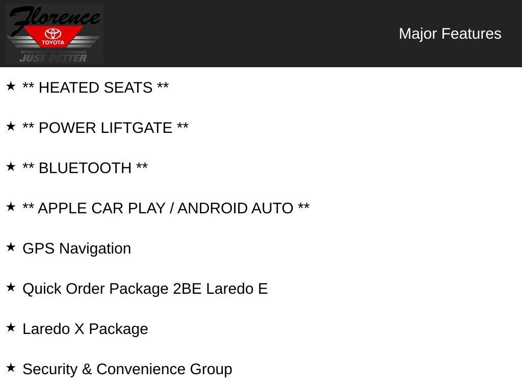 At Florence Toyota come see how our USED CARS are JUST BETTER . We offer the following benefits: Lifetime Power Train (Some exclusions apply), 1st Year Maintenance, $500 Additional Trade In Appraisal, 72 Hour Vehicle Exchange Program, Yearly Vehicle Appraisal & Safety Inspection, VIP Loyalty Program, Routine Express Service, Courtesy Service Shuttle, Express Buying Service. Also, as an added benefit we will buy your vehicle even if you don't buy ours!! Call today (866)830-0793or visit us at www.florencetoyota.com *Customer must trade-in a vehicle to receive $1,000 Trade Assist credit that is included in the online price. **Financing must be provided by a third-party lender using this dealership’s assistance for Customer to receive $1,000 Financing Assist credit that is included in the online price. See dealer for complete details.