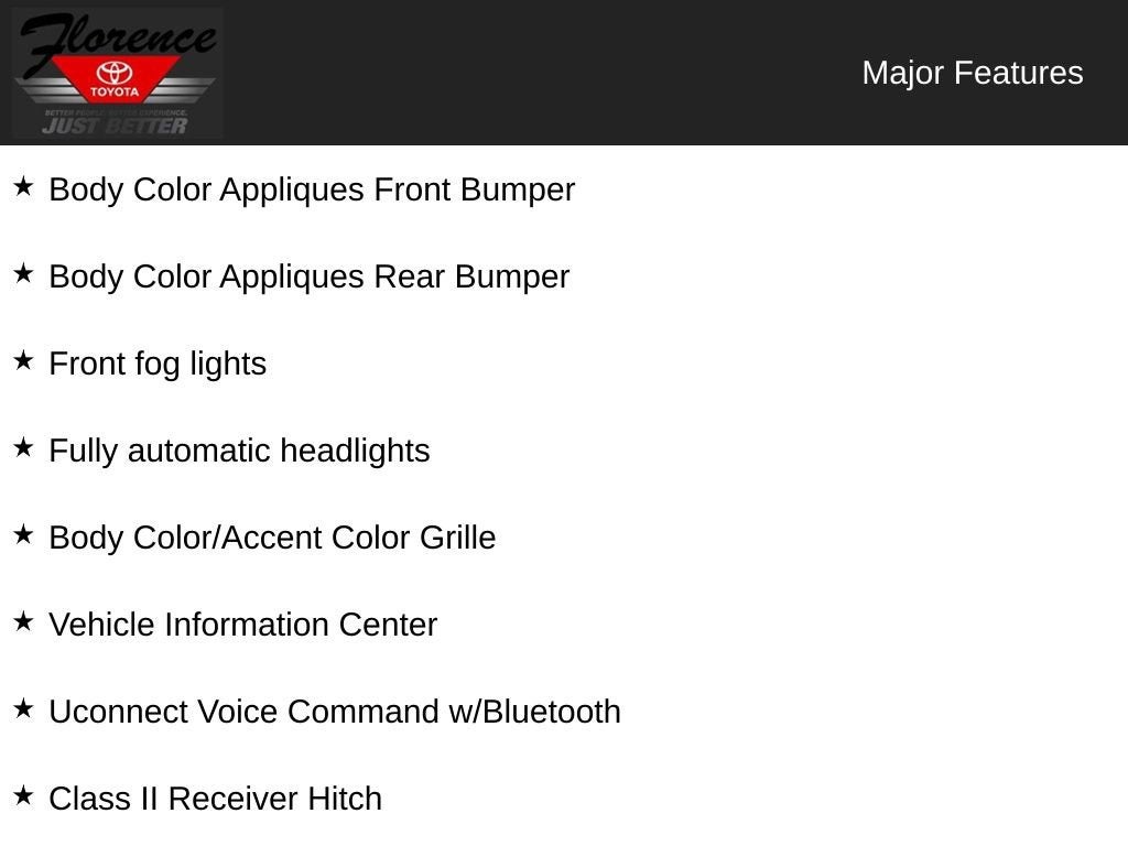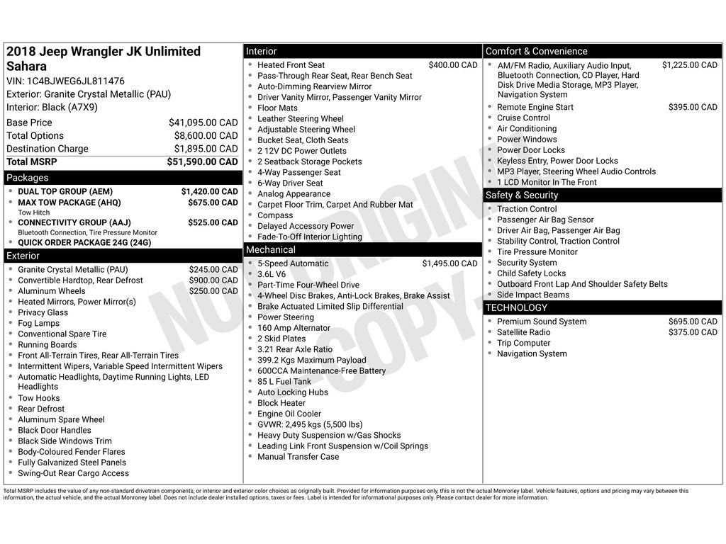 Max Tow Package: Class II Hitch Receiver; 4-Pin Wiring Harness; 3.73 Rear Axle Ratio. Quick Order Package 24G: A/C Refrigerant; Body-Colour Grille with Bright Accent; Front Bumper Accents; Rear Bumper Accents. Connectivity Group: Electronic Vehicle Information Centre; Hands-Free Communication with Bluetooth®; Tire Pressure Monitoring System. Dual Top Group: Black Sunrider Soft Top. Quick Order Package 23G: A/C Refrigerant; Body-Colour Grille with Bright Accent; Front Bumper Accents; Rear Bumper Accents. 430 Nav Radio. Alpine Premium Audio System. Front Heated Seats. Remote Start System. SiriusXM Satellite Radio. 18" X 7.5" 7-Spoke Polished Aluminum Wheels. Granite Crystal Metallic. 3.73 Rear Axle Ratio. **Equipment listed is based on original vehicle build and subject to change. Please confirm the accuracy of the included equipment by calling the dealer prior to purchase.**