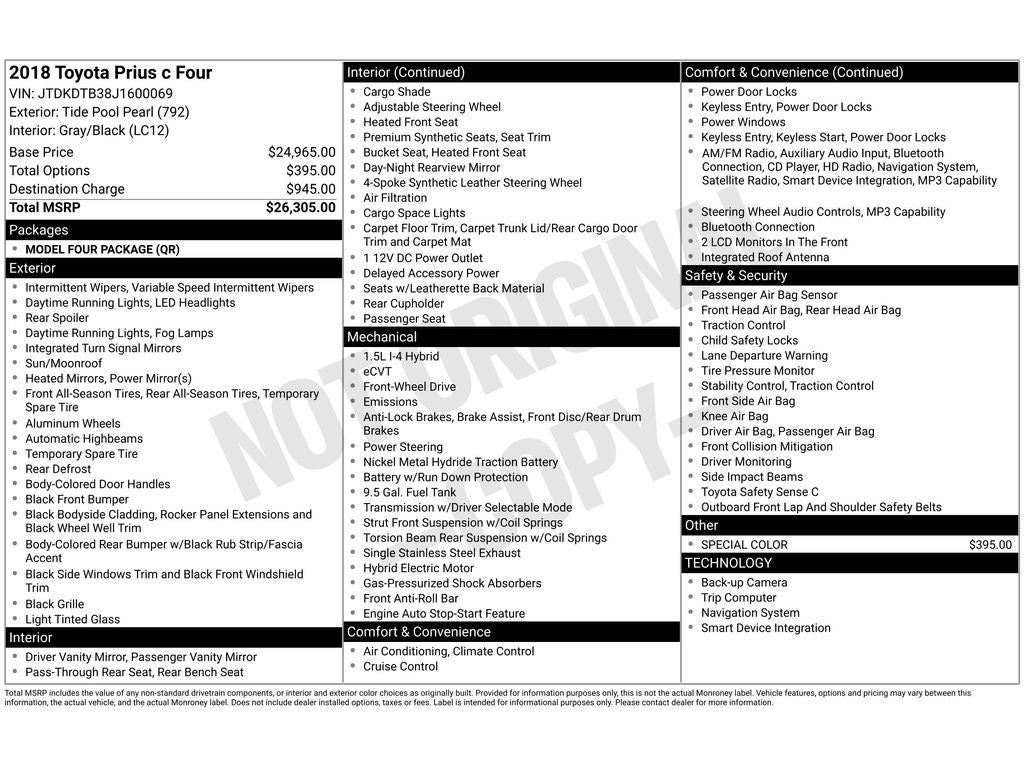 Bluetooth® technology is built into the vehicle, keeping your hands on the steering wheel and your focus on the road. This small car keeps you comfortable with Auto Climate. It has a clean CARFAX vehicle history report. The leather seats in it are a must for buyers looking for comfort, durability, and style. Protect it from unwanted accidents with a cutting edge backup camera system. You'll never again be lost in a crowded city or a country region with the navigation system on this Toyota Prius c. Set the temperature exactly where you are most comfortable in it. The fan speed and temperature will automatically adjust to maintain your preferred zone climate. This model is front wheel drive. This 2018 Toyota Prius c has a 4 Cyl, 1.5L high output engine. This Toyota Prius c shines with clean polished lines coated with an elegant white finish. The Electronic Stability Control will keep you on your intended path.