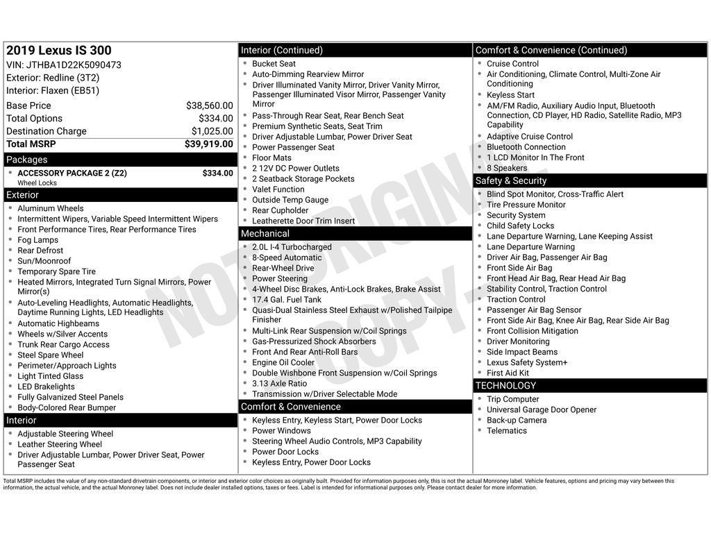 This vehicle has auto-adjust speed for safe following. The leather seats in it are a must for buyers looking for comfort, durability, and style. Protect this small car from unwanted accidents with a cutting edge backup camera system. This model enhances safety with a blind spot monitor, alerting drivers to potential dangers in adjacent lanes. It features a hands-free Bluetooth® phone system. The Lexus IS 300 keeps you comfortable with Auto Climate. Maintaining a stable interior temperature in this vehicle is easy with the climate control system. This vehicle is rear wheel drive. This unit has a 4 Cyl, 2.0L high output engine. It excites both driver and bystanders with a polished red exterior with racy lines. The Lexus IS 300 is accented with premium quality alloy wheels. This small car is equipped with a gasoline engine. The Lexus IS 300 has an automatic transmission. Help alleviate lower back pain with the driver seat lumbar support in the vehicle.