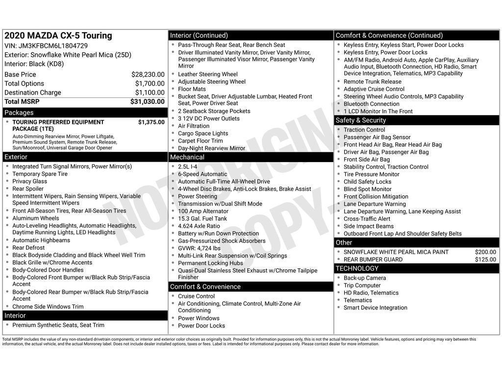 See what's behind you with the back up camera on this vehicle. This 2020 Mazda CX-5 keeps you comfortable with Auto Climate. Apple CarPlay: Seamless smartphone integration for this Mazda CX-5 - stay connected and entertained on the go! This vehicle features a high end BOSE stereo system. This small suv has a clean CARFAX vehicle history report. The leather seats in the Mazda CX-5 are a must for buyers looking for comfort, durability, and style. It's blind spot monitor enhances safety. This small suv offers Android Auto for seamless smartphone integration. This model features a hands-free Bluetooth® phone system. Maintaining a stable interior temperature in this 2020 Mazda CX-5 is easy with the climate control system. This unit features a HomeLink System. This unit embodies class and sophistication with its refined white exterior. Load groceries and much more with ease into this 2020 Mazda CX-5 thanks to the power liftgate.