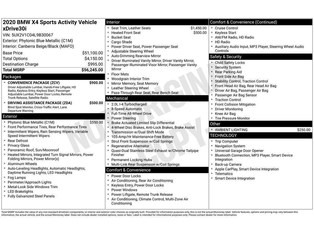 Bluetooth® technology is built into this unit, keeping your hands on the steering wheel and your focus on the road. See what's behind you with the back up camera on this small suv. This unit's Lane Departure Warning helps keep you in your lane. The rear parking assist technology on it will put you at ease when reversing. The system alerts you as you get closer to an obstruction. The satellite radio system in this model gives you access to hundreds of nation-wide radio stations with a clear digital signal. This unit has a clean CARFAX vehicle history report. This model is equipped with the latest generation of XM/Sirius Radio. You'll never again be lost in a crowded city or a country region with the navigation system on it. This BMW X4 offers Automatic Climate Control for personalized comfort. Apple CarPlay: Seamless smartphone integration for the BMW X4 - stay connected and entertained on the go!