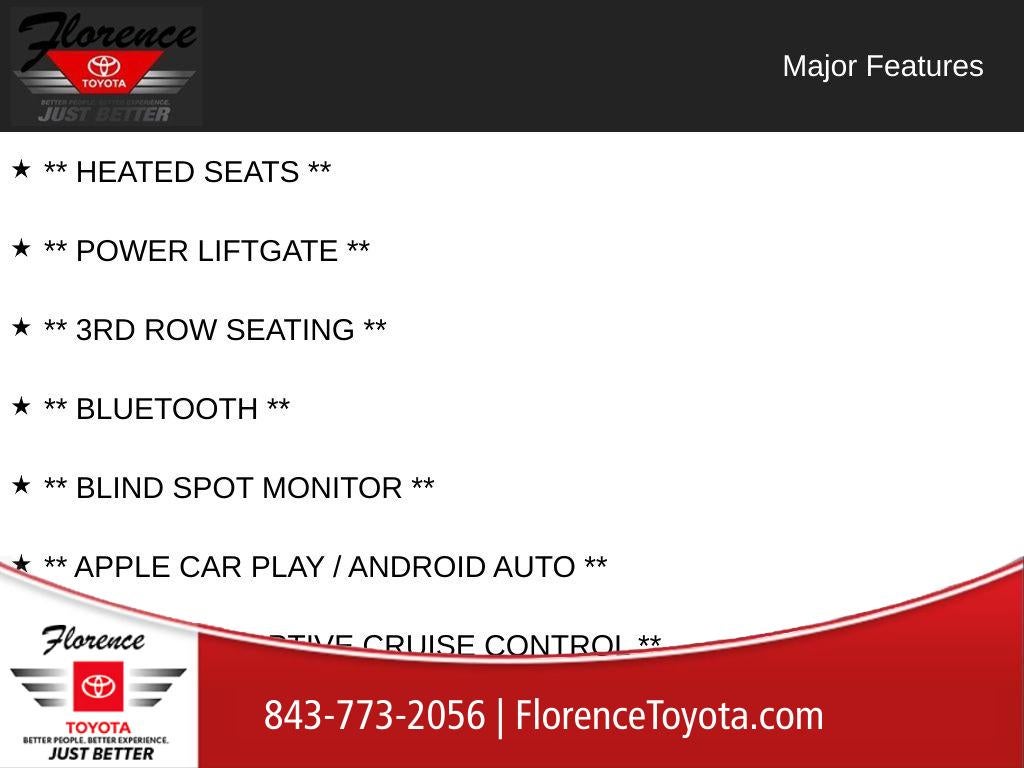 Versatile and capable, the Highlander's roomy interior and 3rd-row seating make it the perfect companion for family adventures, weekend getaways, and everything in between. The power liftgate and blind spot monitoring add an extra layer of convenience and confidence to your driving experience.