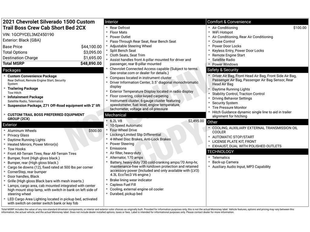 Custom Convenience Package: LED Cargo Area Lighting; EZ Lift Power Lock and Release Tailgate; Remote Vehicle Starter System; Electric Rear-Window Defogger. Preferred Equipment Group 2CX: Rear 60/40 Folding Bench Seat (folds Up); Cloth Seat Trim; Bluetooth® For Phone; 170 Amp Alternator; Compass; 40/20/40 Front Split Bench Seat; 3.5" Diagonal Monochromatic Display; Trailering Package; Standard Tailgate; Suspension Package; Color-Keyed Carpeting Floor Covering; Power Front Windows with Passenger Express Down; Remote Keyless Entry; Front Rubberized Vinyl Floor Mats; Rear Rubberized-Vinyl Floor Mats; 2-Speed Transfer Case; Deep-Tinted Glass; Electronic Cruise Control; Power Rear Windows with Express Down; Performance Red Recovery Hooks; Manual Tilt Wheel Steering Column; Power Front Windows with Driver Express Up/down; High Gloss Black Grille; Auto-Locking Rear Differential; Power Door Locks. Infotainment Package: OnStar and Chevrolet Connected Services Capable; SiriusXM Radio. 20" X 9" High Gloss Black Painted Aluminum Wheels. Single-Zone Manual/semi-Automatic Air Conditioning. **Equipment listed is based on original vehicle build and subject to change. Please confirm the accuracy of the included equipment by calling the dealer prior to purchase.**