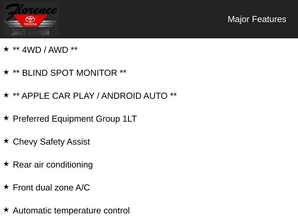 Chevy Safety Assist: Lane Keep Assist with Lane Departure Warning; Forward Collision Alert; Automatic Heated Steering Wheel; Front Pedestrian Braking; Following Distance Indicator; Automatic Emergency Braking; IntelliBeam Auto High Beam Control Headlamps. Preferred Equipment Group 1LT. Front License Plate Bracket Mounting Package. **Equipment listed is based on original vehicle build and subject to change. Please confirm the accuracy of the included equipment by calling the dealer prior to purchase.**