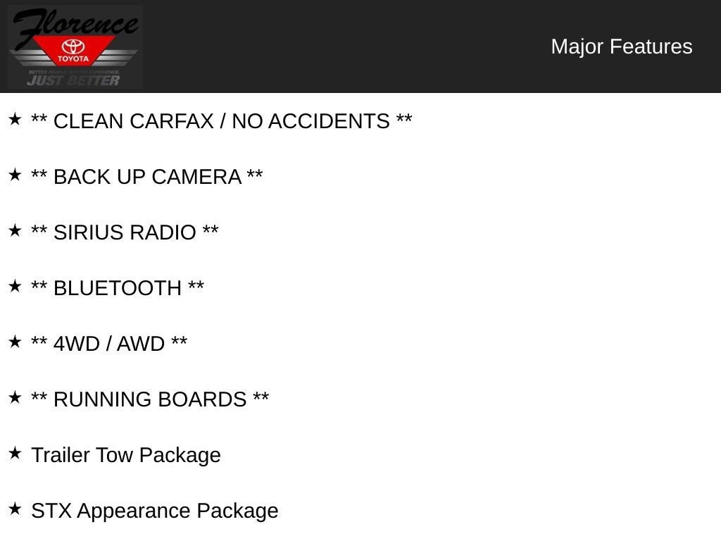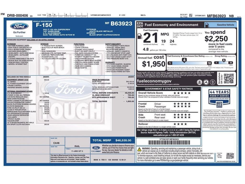 Ford Co-Pilot360 2.0: Reverse Sensing System; Post-Collision Braking; Rear View Camera; Lane-Keeping System; Reverse Brake Assist; Pre-Collision Assist with Automatic Emergency Braking; Auto High Beam; BLIS with Cross-Traffic Alert. STX Appearance Package: Box Side Decals; 18" 6-Spoke Machined-Aluminum Wheels; 275/65R18 OWL A/T Tires; Body-Color Surround with Black Mesh Insert Grille; Manual Driver/passenger Lumbar; Rear Window Fixed Privacy Glass; Driver/passenger Seat Back Pocket; Body-Color Front and Rear Bumpers; Rear Window Defroster. Equipment Group 101A High: Reverse Sensing System; Electronic 10-Speed Automatic Transmission; Cruise Control; AM/FM Stereo with 6 Speakers. Tailgate Step with Tailgate Work Surface. Power Glass Heated Sideview Mirrors. Unique Sport Cloth 40/console/40 Front-Seats. Reverse Sensing System. Black Platform Running Boards. Cruise Control. Rear Window Defroster. Class IV Trailer Hitch Receiver. Color-Coordinated Carpet with Carpet Floor Mats. Rear Window Fixed Privacy Glass. **Equipment listed is based on original vehicle build and subject to change. Please confirm the accuracy of the included equipment by calling the dealer prior to purchase.**