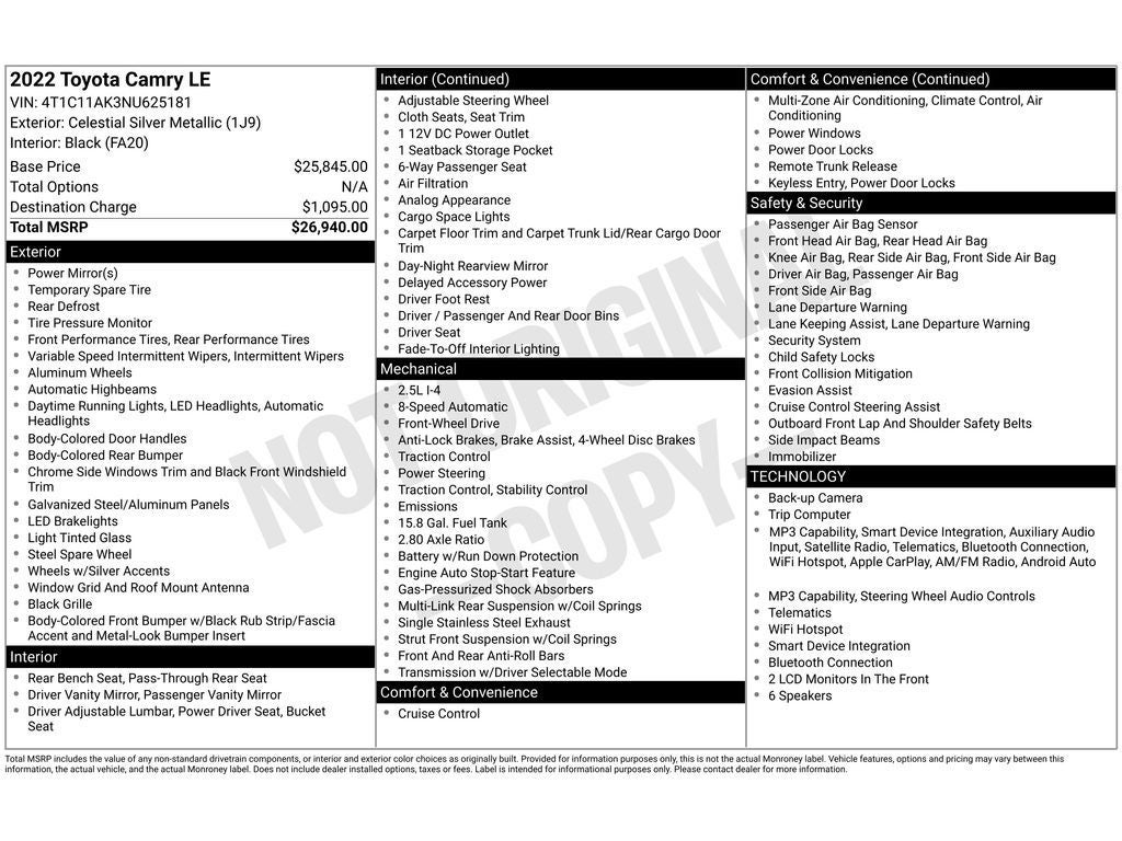The Toyota Camry comes equipped with Android Auto for seamless smartphone integration on the road. Bluetooth® technology is built into this unit, keeping your hands on the steering wheel and your focus on the road. Apple CarPlay: Seamless smartphone integration for this vehicle - stay connected and entertained on the go! This Toyota Camry offers Automatic Climate Control for personalized comfort. Protect it from unwanted accidents with a cutting edge backup camera system. This vehicle has a 4 Cyl, 2.5L high output engine. This 2022 Toyota Camry shines with an exquisite metallic silver exterior finish. Maintaining a stable interior temperature in this vehicle is easy with the climate control system. Front wheel drive on the vehicle gives you better traction and better fuel economy. Help alleviate lower back pain with the driver seat lumbar support in this 2022 Toyota Camry . The Toyota Camry has an automatic transmission. Easily set your speed in this unit with a state of the art cruise control system. Increase or decrease velocity with the touch of a button.