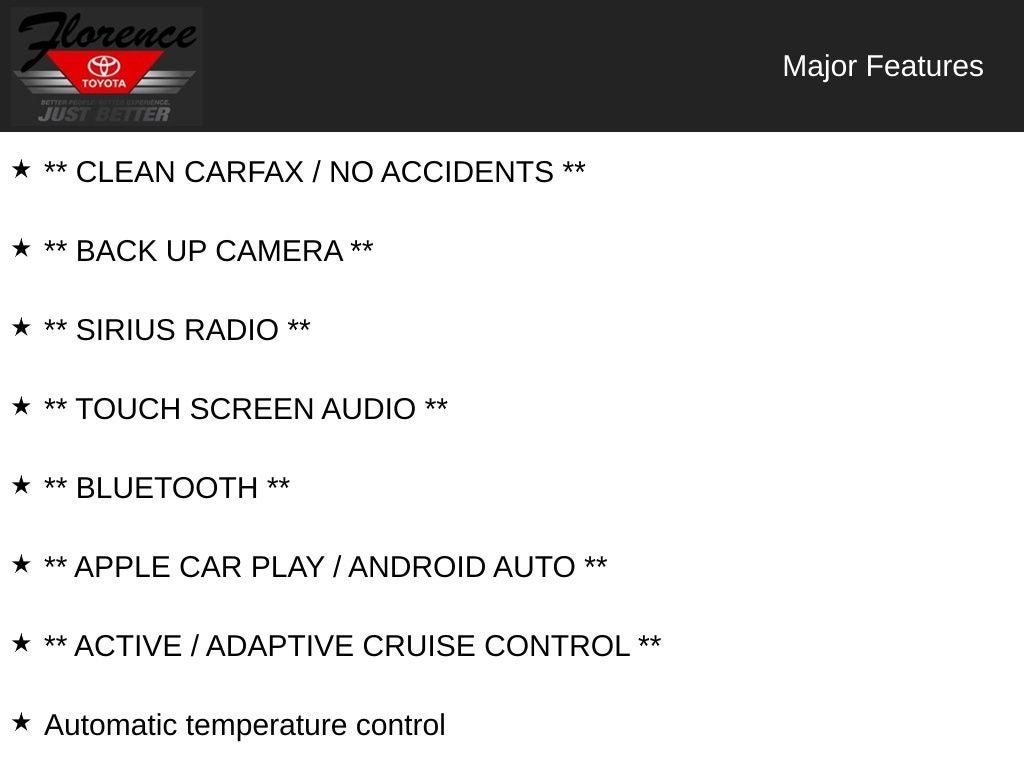 At Florence Toyota come see how our USED CARS are JUST BETTER. We offer the following benefits: Lifetime Power Train (Some exclusions apply), 1st Year Maintenance, $500 Additional Trade In Appraisal, 72 Hour Vehicle Exchange Program, Yearly Vehicle Appraisal & Safety Inspection, VIP Loyalty Program, Routine Express Service, Courtesy Service Shuttle, Express Buying Service. Also, as an added benefit we will buy your vehicle even if you don't buy ours!! Call today (866)830-0793 or visit us at www.florencetoyota.com *Customer must trade-in a vehicle to receive $1,000 Trade Assist credit that is included in the online price. **Financing must be provided by a third-party lender using this dealership's assistance for Customer to receive $1,000 Financing Assist credit that is included in the online price. See dealer for complete details.