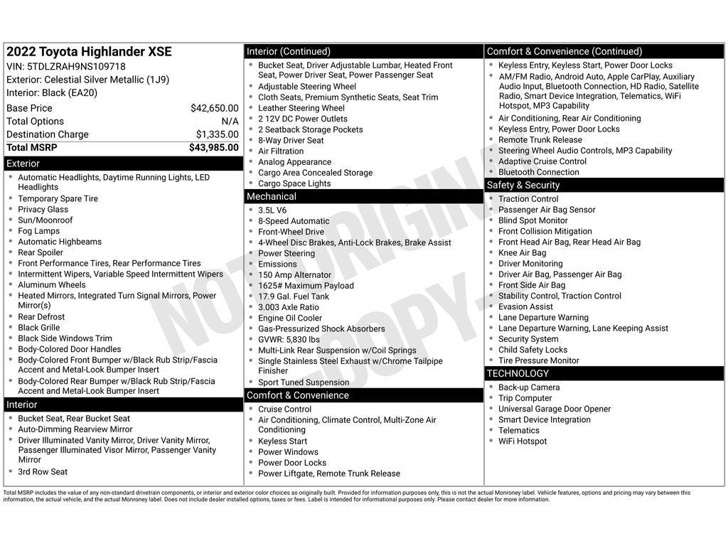 The leather seats in the vehicle are a must for buyers looking for comfort, durability, and style. See what's behind you with the back up camera on this vehicle. This vehicle enhances safety with a blind spot monitor, alerting drivers to potential dangers in adjacent lanes. This mid-size suv offers Android Auto for seamless smartphone integration. Good News! This certified CARFAX 1-owner vehicle has only had one owner before you. This Toyota Highlander has a clean CARFAX vehicle history report. This Toyota Highlander offers Apple CarPlay for seamless connectivity. The Toyota Highlander features a hands-free Bluetooth® phone system. It offers Automatic Climate Control for personalized comfort. Never get into a cold vehicle again with the remote start feature on the Toyota Highlander. This vehicle's Cross-Traffic Alert: Safeguarding you from unexpected traffic when reversing. This 2022 Toyota Highlander gleams with an elegant silver clear coated finish. This vehicle is front wheel drive.