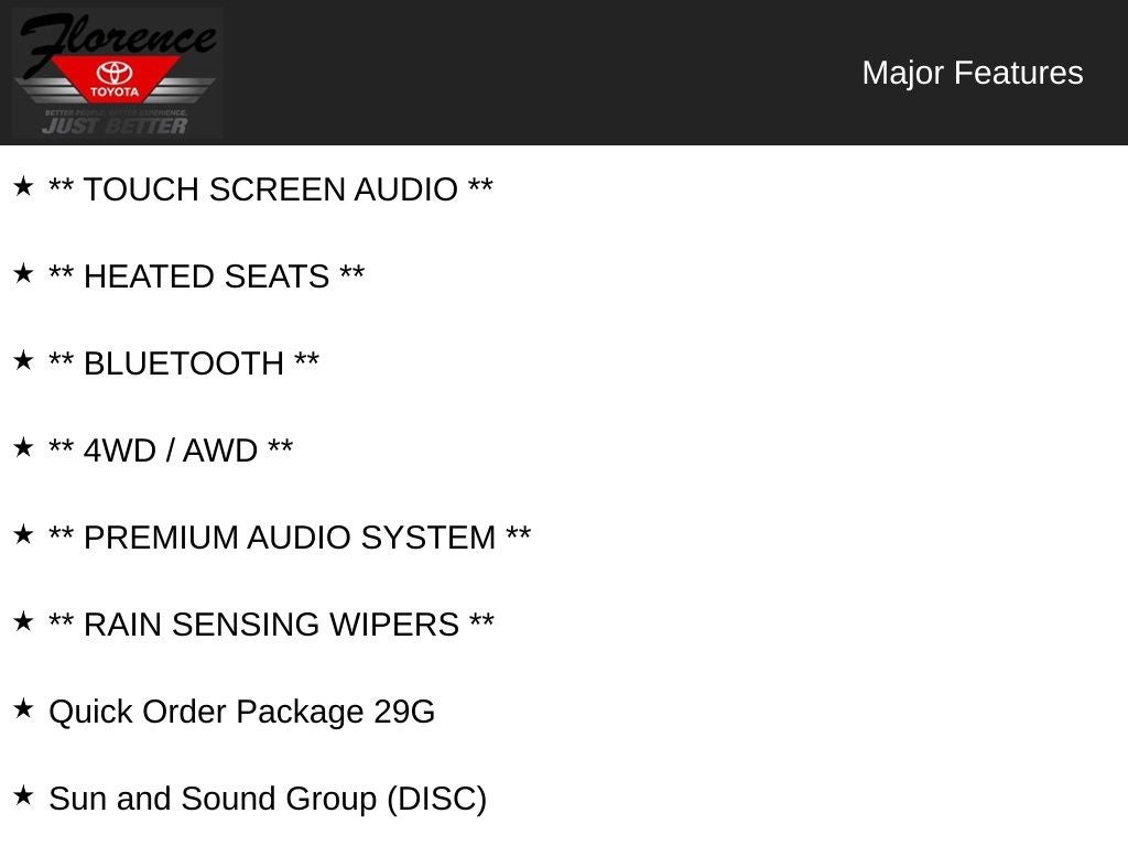 At Florence Toyota, come see how our USED CARS are JUST BETTER. We offer the following benefits: Lifetime Power Train (Some exclusions apply), 1st Year Maintenance, $500 Additional Trade In Appraisal, 72 Hour Vehicle Exchange Program, Yearly Vehicle Appraisal & Safety Inspection, VIP Loyalty Program, Routine Express Service, Courtesy Service Shuttle, Express Buying Service. Also, as an added benefit, we will buy your vehicle even if you don't buy ours!! Call today (866)830-0793 or visit us at www.florencetoyota.com *Customer must trade-in a vehicle to receive $1,000 Trade Assist credit that is included in the online price. **Financing must be provided by a third-party lender using this dealership's assistance for Customer to receive $1,000 Financing Assist credit that is included in the online price. See dealer for complete details.