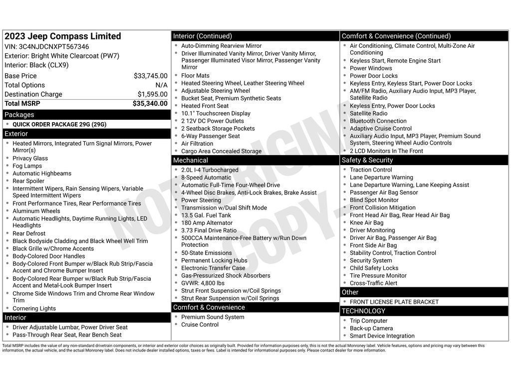 This vehicle offers Android Auto for seamless smartphone integration. This 2023 Jeep Compass offers Automatic Climate Control for personalized comfort. Bluetooth® technology is built into the Jeep Compass, keeping your hands on the steering wheel and your focus on the road. Start the vehicle from inside with remote start. This vehicle is pure luxury with a heated steering wheel. Apple CarPlay: Seamless smartphone integration for this vehicle - stay connected and entertained on the go! This model's Forward Collision Warning system alerts the driver to potential front-end collisions, enhancing safety. The leather seats in this Jeep Compass are a must for buyers looking for comfort, durability, and style. Protect this unit from unwanted accidents with a cutting edge backup camera system. This mid-size suv has auto-adjust speed for safe following. When you encounter slick or muddy roads, you can engage the four wheel drive on the vehicle and drive with confidence.