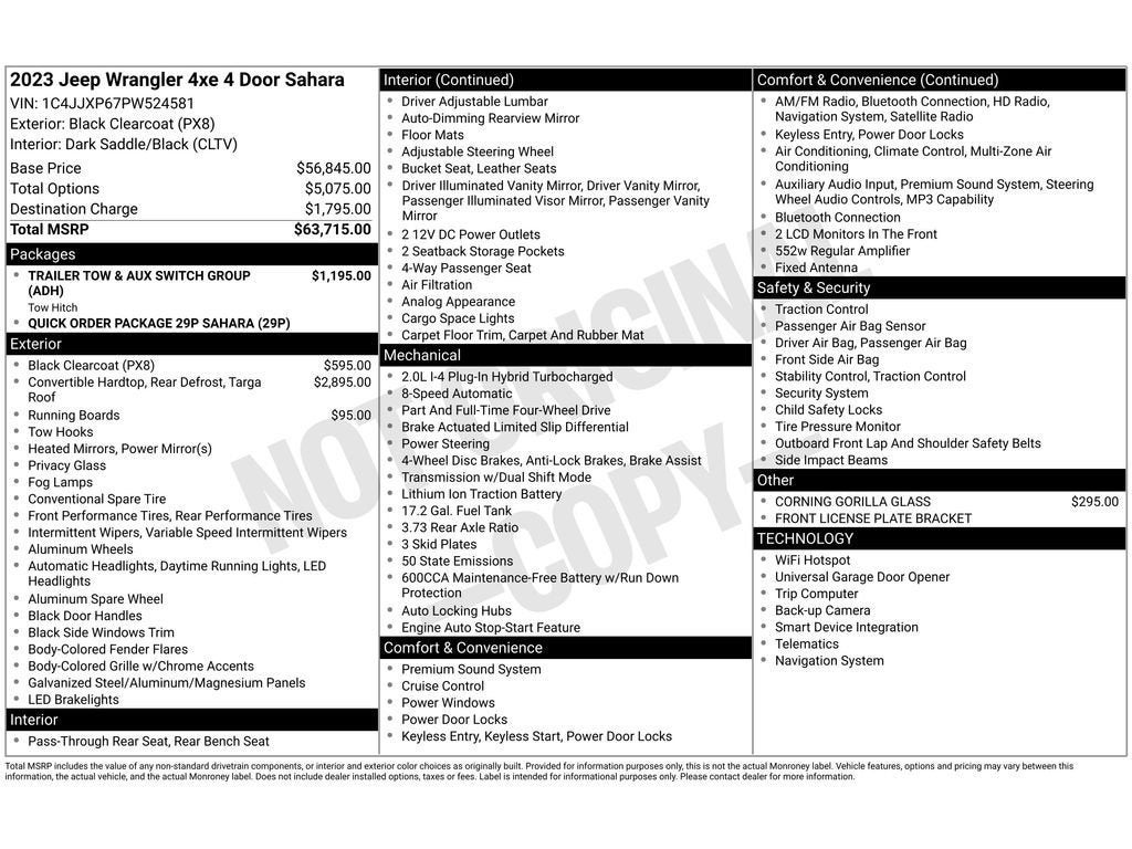 Quick Order Package 29P Sahara. Trailer Tow and Auxiliary Switch Group: Class II Receiver Hitch; 700 Amp Maintenance Free Battery; 7 and 4 Pin Wiring Harness; Auxiliary Switches. Body Color 3-Piece Hard Top. Black Clearcoat. Corning Gorilla Glass. Side Steps. **Equipment listed is based on original vehicle build and subject to change. Please confirm the accuracy of the included equipment by calling the dealer prior to purchase.**