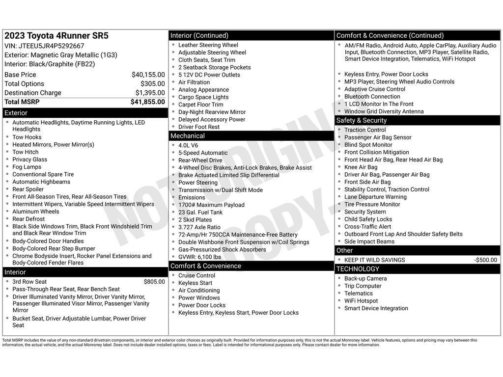 This model offers Apple CarPlay for seamless connectivity. This Toyota 4Runner offers Android Auto for seamless smartphone integration. Protect this mid-size suv from unwanted accidents with a cutting edge backup camera system. This vehicle is a certified CARFAX 1-owner. This mid-size suv features a hands-free Bluetooth® phone system. Our dealership has already run the CARFAX report and it is clean. A clean CARFAX is a great asset for resale value in the future. The vehicle's blind spot monitor enhances safety. The vehicle's Cross-Traffic Alert: Safeguarding you from unexpected traffic when reversing. The Toyota 4Runner has a V6, 4.0L high output engine. This model is rear wheel drive. This model emanates grace with its stylish gray exterior. The high efficiency automatic transmission shifts smoothly and allows you to relax while driving. The Electronic Stability Control will keep you on your intended path. This 2023 Toyota 4Runner is equipped with a gasoline engine.