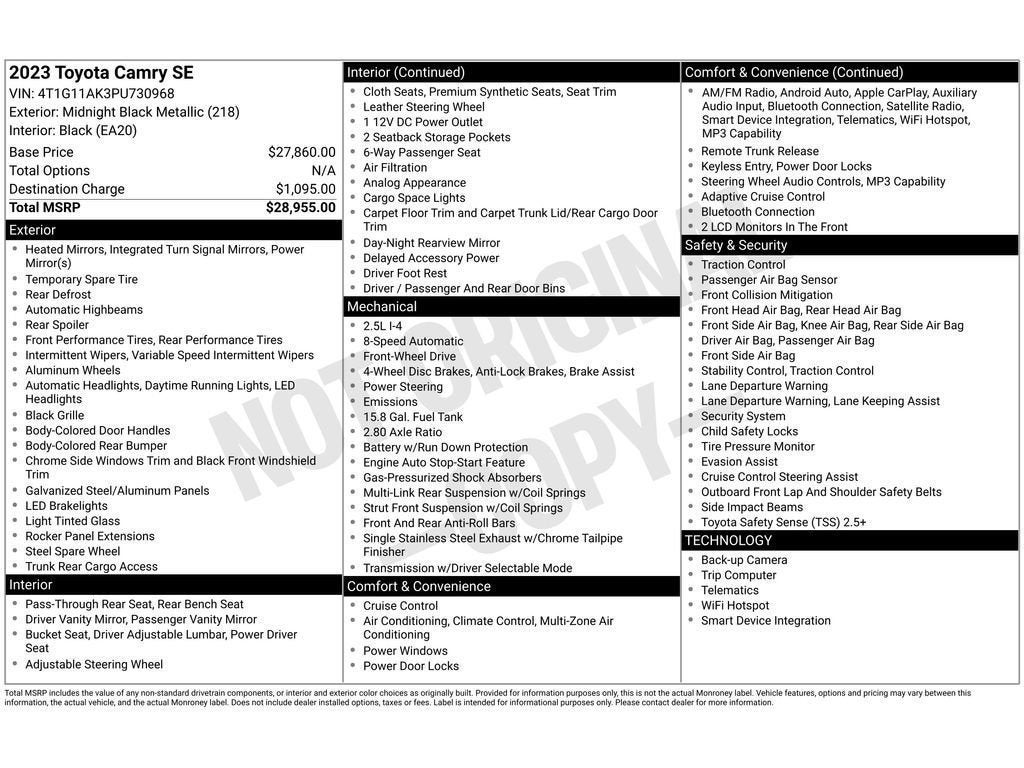 2023 Toyota Camry SE - FWD, 2.5L 4-Cylinder, Florence SC This 2023 Toyota Camry SE pairs efficient performance with modern comfort, featuring a responsive 2.5L 4-cylinder gasoline engine and smooth front-wheel drive—ideal for daily commuting or weekend trips around Florence, SC. The Toyota Camry SE delivers a refined ride with sporty styling, precise handling, and competitive fuel economy, making it a practical choice for drivers seeking reliability and value. Inside, enjoy premium amenities including leather seats that provide comfort and durability, plus automatic climate control to keep the cabin comfortable in any season. Stay connected with Hands-Free Bluetooth® and seamless Apple CarPlay integration for navigation, music, and hands-free messaging. Safety and convenience are enhanced by a Back-Up Camera for confident parking and reversing maneuvers. This Toyota Camry SE has been carefully maintained and inspected to ensure dependable performance and long-lasting value. Competitive pricing positions this vehicle as the best-priced option in the area—excellent value for a late-model Toyota with desirable features. Located in Florence, SC, this Toyota Camry is ready for a test drive and immediate delivery. Whether you prioritize fuel efficiency, modern tech, or a comfortable interior, this 2023 Toyota Camry SE is a standout choice in the pre-owned vehicle market. Schedule a visit in Florence today to experience it firsthand.