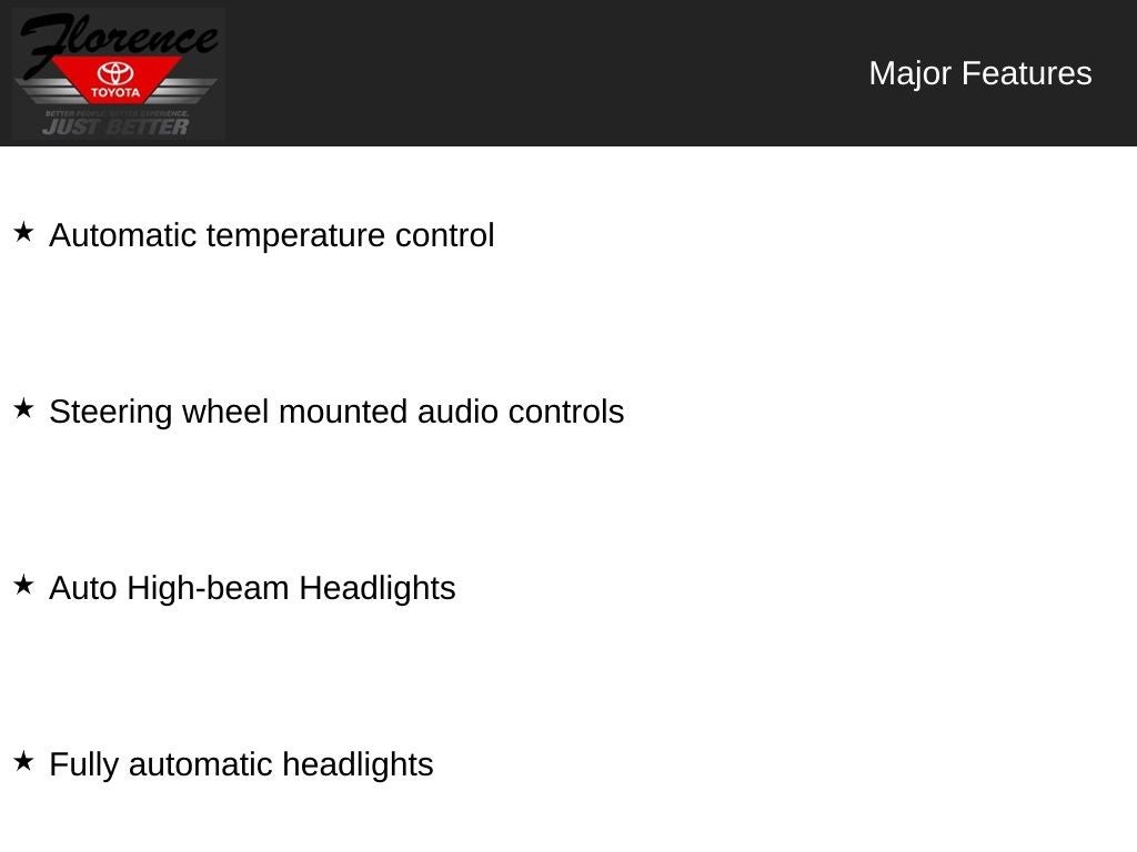 At Florence Toyota come see how our USED CARS are JUST BETTER. We offer the following benefits: Lifetime Power Train (Some exclusions apply), 1st Year Maintenance, $500 Additional Trade In Appraisal, 72 Hour Vehicle Exchange Program, Yearly Vehicle Appraisal & Safety Inspection, VIP Loyalty Program, Routine Express Service, Courtesy Service Shuttle, Express Buying Service. Also, as an added benefit we will buy your vehicle even if you don't buy ours!! Call today (866)830-0793 or visit us at www.florencetoyota.com *Customer must trade-in a vehicle to receive $1,000 Trade Assist credit that is included in the online price. **Financing must be provided by a third-party lender using this dealership's assistance for Customer to receive $1,000 Financing Assist credit that is included in the online price. See dealer for complete details.