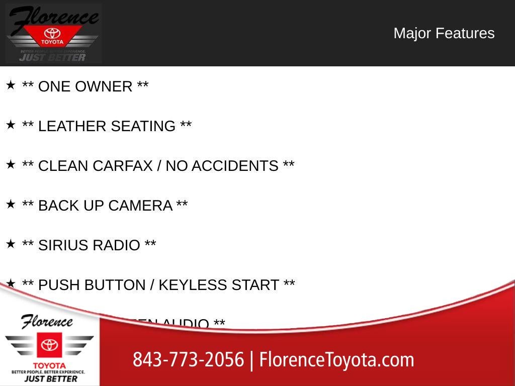 At Florence Toyota come see how our USED CARS are JUST BETTER. We offer the following benefits: Lifetime Power Train (Some exclusions apply), 1st Year Maintenance, $500 Additional Trade In Appraisal, 72 Hour Vehicle Exchange Program, Yearly Vehicle Appraisal & Safety Inspection, VIP Loyalty Program, Routine Express Service, Courtesy Service Shuttle, Express Buying Service. Also, as an added benefit we will buy your vehicle even if you don't buy ours!! Call today (866)830-0793 or visit us at www.florencetoyota.com *Customer must trade-in a vehicle to receive $1,000 Trade Assist credit that is included in the online price. **Financing must be provided by a third-party lender using this dealership's assistance for Customer to receive $1,000 Financing Assist credit that is included in the online price. See dealer for complete details.