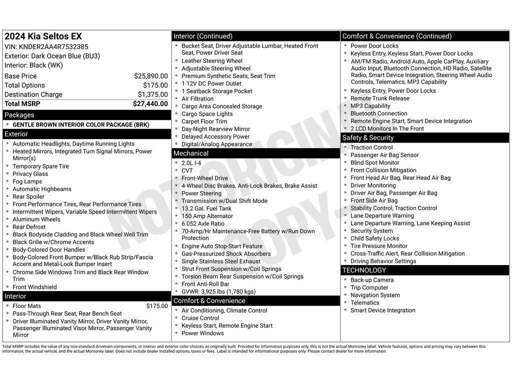 2024 Kia Seltos EX - sleek, versatile and ready in Florence, SC. This like-new crossover presents with 0 miles and low mileage, offering modern style, confident handling and a comfortable cabin tailored for daily driving or weekend escapes. Powered by a refined 2.0L 4-cylinder gasoline engine with front-wheel drive and an efficient automatic transmission, the Kia Seltos EX balances responsive performance with composed ride quality. Inside, premium leather seats provide lasting comfort and a refined feel, while automatic climate control keeps the interior comfortable in any weather. Tech-forward convenience includes remote start for quick, climate-controlled entry and advanced collision avoidance systems designed to enhance driver awareness and safety on the road. A CARFAX Clean Report accompanies this vehicle, documenting its pristine history for added peace of mind. The exterior combines sharp lines and functional design, offering easy maneuverability in urban settings and stable performance on longer trips. Thoughtful storage, intuitive controls and quality materials throughout the cabin ensure a pleasant experience for driver and passengers alike. Located in Florence, SC, this 2024 Kia Seltos EX is inspected and ready for immediate viewing. Whether you're upgrading to a more refined crossover or seeking a reliable second vehicle, this Kia Seltos delivers contemporary features, safety-focused technology and a comfortable ride. Contact the showroom to schedule a test drive or personal appointment.