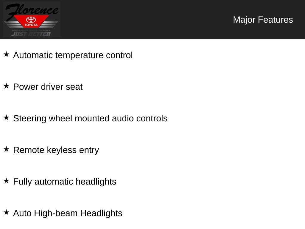 At Florence Toyota come see how our USED CARS are JUST BETTER . We offer the following benefits: Lifetime Power Train (Some exclusions apply), 1st Year Maintenance, $500 Additional Trade In Appraisal, 72 Hour Vehicle Exchange Program, Yearly Vehicle Appraisal & Safety Inspection, VIP Loyalty Program, Routine Express Service, Courtesy Service Shuttle, Express Buying Service. Also, as an added benefit we will buy your vehicle even if you don't buy ours!! Call today (866)830-0793 or visit us at www.florencetoyota.com *Customer must trade-in a vehicle to receive $1,000 Trade Assist credit that is included in the online price. **Financing must be provided by a third-party lender using this dealership's assistance for Customer to receive $1,000 Financing Assist credit that is included in the online price. See dealer for complete details.
