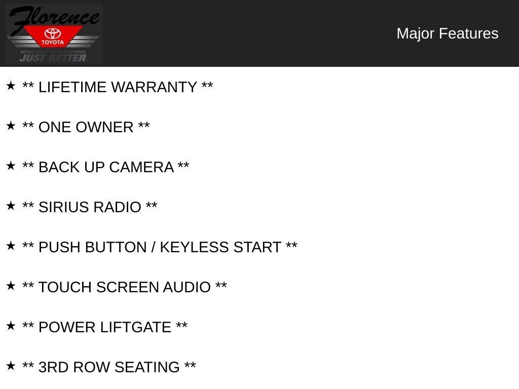 At Florence Toyota, come see how our USED CARS are JUST BETTER. We offer the following benefits: Lifetime Power Train (Some exclusions apply), 1st Year Maintenance, $500 Additional Trade In Appraisal, 72 Hour Vehicle Exchange Program, Yearly Vehicle Appraisal & Safety Inspection, VIP Loyalty Program, Routine Express Service, Courtesy Service Shuttle, Express Buying Service. Also, as an added benefit, we will buy your vehicle even if you don't buy ours!! Call today (866)830-0793 or visit us at www.florencetoyota.com *Customer must trade-in a vehicle to receive $1,000 Trade Assist credit that is included in the online price. **Financing must be provided by a third-party lender using this dealership's assistance for Customer to receive $1,000 Financing Assist credit that is included in the online price. See dealer for complete details.