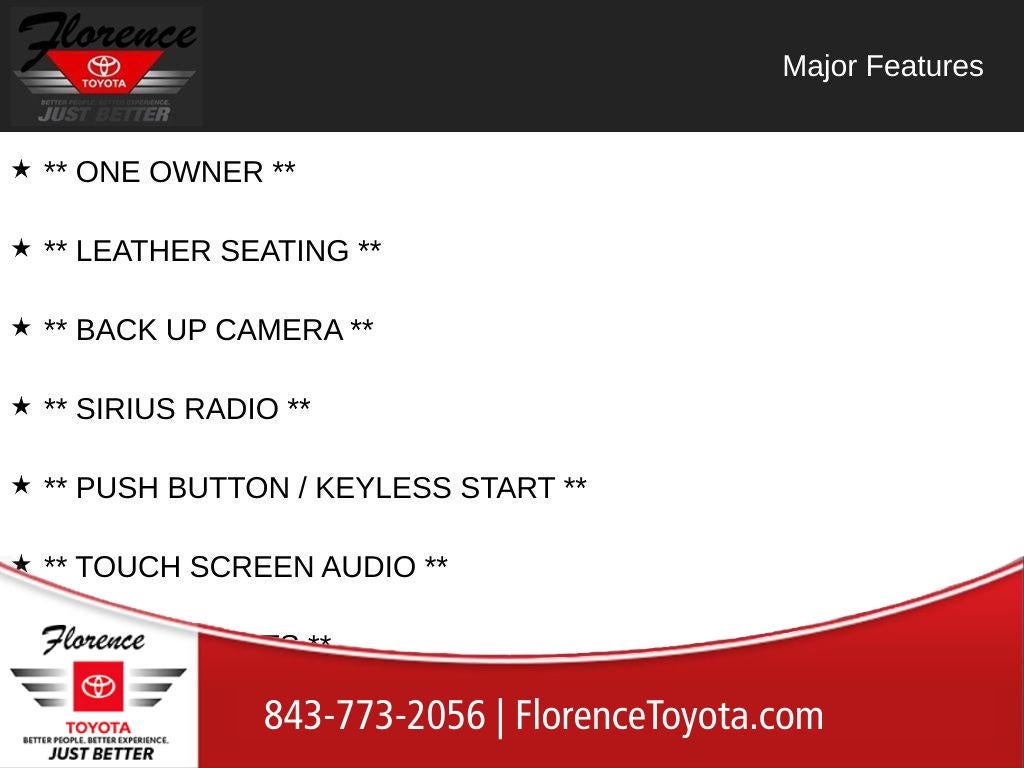 At Florence Toyota, come see how our USED CARS are JUST BETTER. We offer the following benefits: Lifetime Power Train (Some exclusions apply), 1st Year Maintenance, $500 Additional Trade In Appraisal, 72 Hour Vehicle Exchange Program, Yearly Vehicle Appraisal & Safety Inspection, VIP Loyalty Program, Routine Express Service, Courtesy Service Shuttle, Express Buying Service. Also, as an added benefit, we will buy your vehicle even if you don't buy ours!! Call today (866)830-0793 or visit us at www.florencetoyota.com *Customer must trade-in a vehicle to receive $1,000 Trade Assist credit that is included in the online price. **Financing must be provided by a third-party lender using this dealership's assistance for Customer to receive $1,000 Financing Assist credit that is included in the online price. See dealer for complete details.