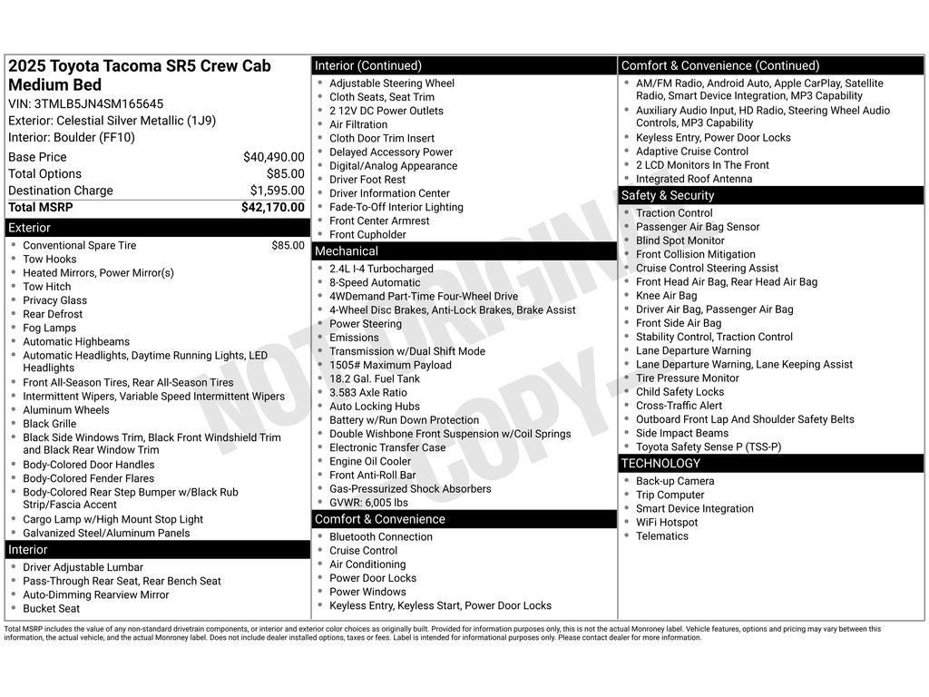 See what's behind you with the back up camera on this vehicle. This small pickup warns of approaching vehicles with Cross-Traffic Alert. Apple CarPlay: Seamless smartphone integration for it - stay connected and entertained on the go! This 2025 Toyota Tacoma 's blind spot monitor enhances safety. Never get into a cold vehicle again with the remote start feature on this vehicle. The vehicle features a hands-free Bluetooth® phone system. It has a clean CARFAX vehicle history report. This model comes equipped with Android Auto for seamless smartphone integration on the road. This vehicle is a certified CARFAX 1-owner. When you encounter slick or muddy roads, you can engage the four wheel drive on this 2025 Toyota Tacoma and drive with confidence. This 2025 Toyota Tacoma has a 4 Cyl, 2.4L high output engine. This small pickup gleams with an elegant silver clear coated finish. The vehicle has fog lights for all weather conditions.