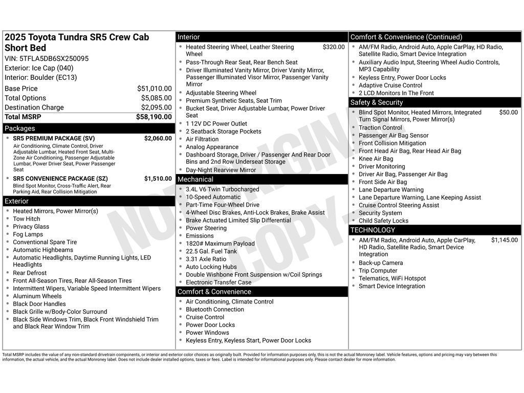 SR5 Convenience Package: 122L Fuel Tank; Blind Spot Monitor with Lane Change Assist; Parking Support Alert/brake. SR5 Premium Package: Automatic Power Tailgate with Easy Closing; SofTex Seat Trim; 8-Way Power-Adjustable Heated Front Seats. TRD Wheel. Exhaust Tip and Predator Drop Step Package. Premium Audio. Heated Leather Steering Wheel. Heated Power Black Outside Mirrors. **Equipment listed is based on original vehicle build and subject to change. Please confirm the accuracy of the included equipment by calling the dealer prior to purchase.**